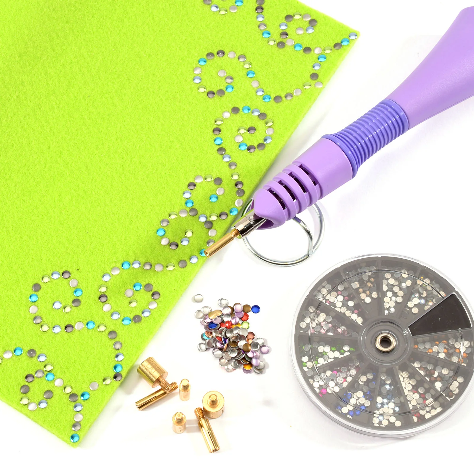 Inclui acessórios planos e curvos para diferentes tipos de pedras e tamanhos de strass (2, 3, 4, 5 e 7 mm).