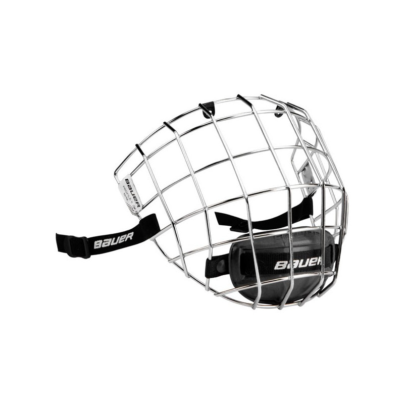 Grelha fabricada em aço de alta resistência, com apoio para queixo flutuante em espuma de 2 densidades e canais de evacuação do suor. O design é oval, com a parte frontal plana.