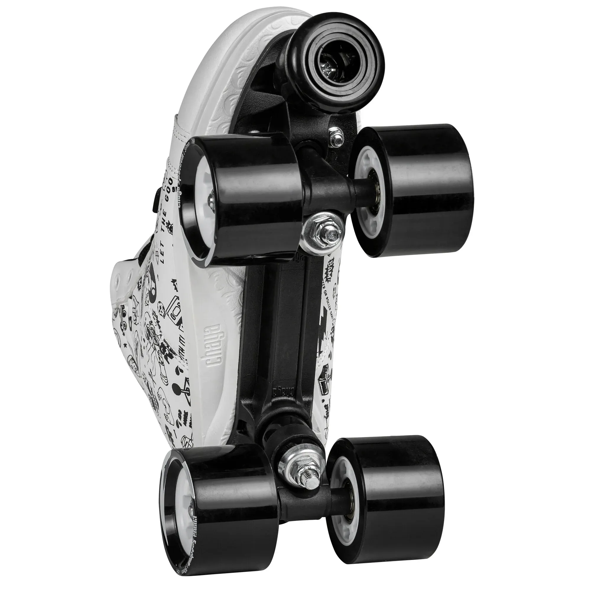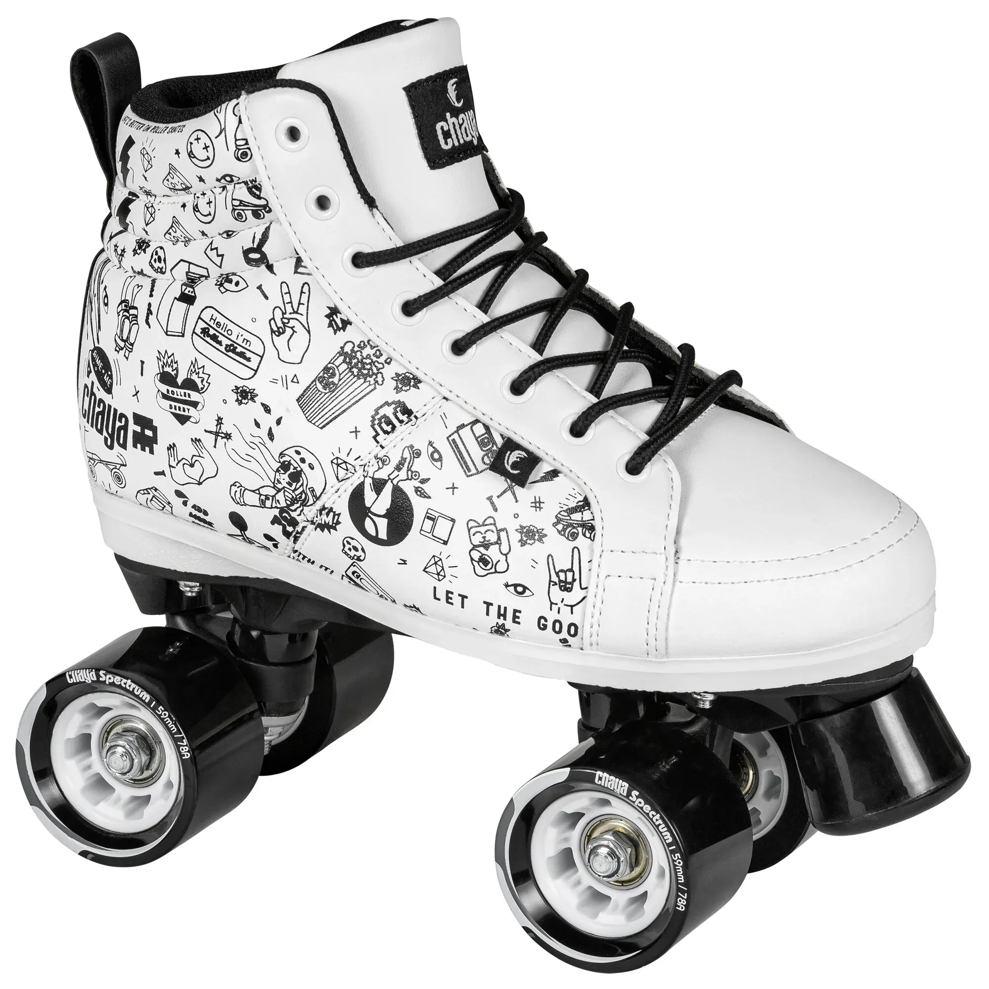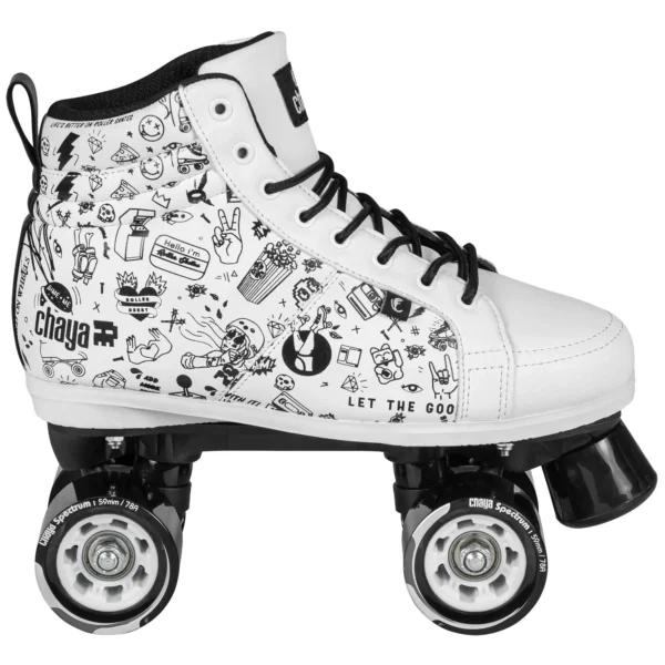 Os Chaya Sketch Roller Skates são patins únicos com design em preto e branco, homenageando o roller derby e o GRL PWR. A bota de corte médio, feita de materiais vegan-friendly, oferece conforto e suporte com acolchoamento e sola interna de EVA. Equipados com rodas Spectrum 59mm/78A para exterior e rolamentos WICKED ABEC 7, proporcionam uma experiência de patinagem confortável.